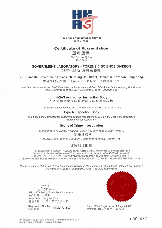The Forensic Science Division of the Hong Kong Government Laboratory gained accreditation to ISO/IEC 17020:2012 for the scenes of crime investigation under the Hong Kong Inspection Body Accreditation Scheme (HKIAS) operated by the Hong Kong Accreditation Service (HKAS). The accreditation assessment was held on 6-8 June 2023 with satisfactory outcomes. The Laboratory had demonstrated its impartiality, the suitability of the methodologies and equipment being used, and the technical competence of the staff involved in handling various crime scene investigation activities, fully complied with the relevant accreditation criteria. The Certificate of Accreditation was issued by the HKAS on 1 August 2023.