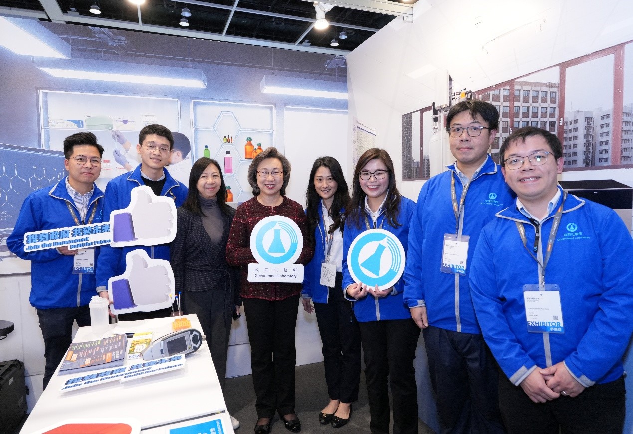 The Government Chemist, Dr. LEE Wai-On (third left) posing a group photo with GL representatives for the event at the GL’s booth during the event.